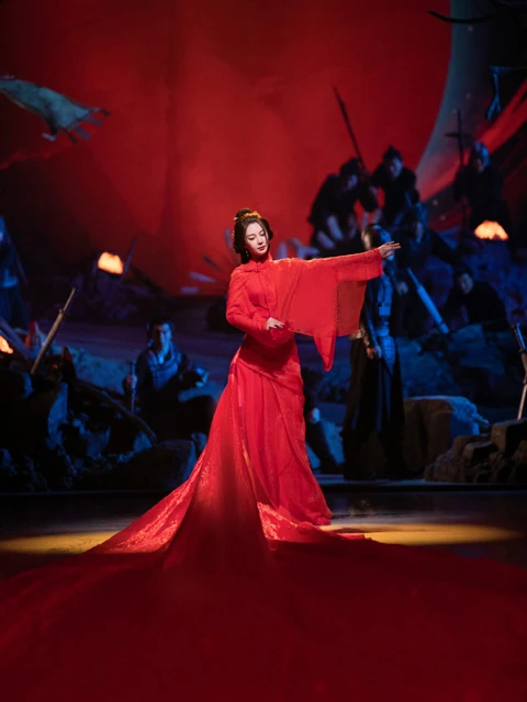 In "The Mews", Yu Ji was acted by Zhang Yuqi. Perhaps because Yu Ji's image in too many picture books is red, the program team chose red hanfu-style costumes. The exaggerated skirt length, made her appear under surrounded on four sides by the songs of Chu, which has more visual impact.