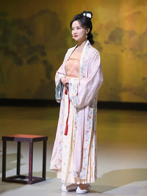 During the Sui and Tang Dynasties, culture and art flourished, and there were many kinds of costumes. It had a gorgeous, beautiful, free, and unrestrained artistic style, showing the beautiful and plump posture of the beauty of the Sui and Tang Dynasties. In the program, the pear garden under the Tang Dynasty is as bright as a pearl, and all kinds of flowers bloom. The costumes and makeup of different characters are completely different, showing the diverse and open aesthetics of women in the Tang Dynasty.