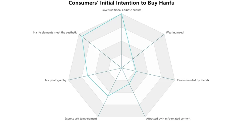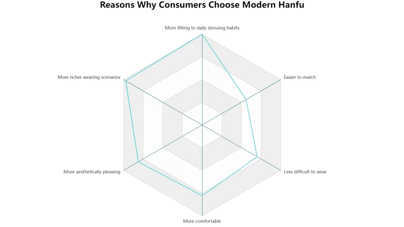 Among those interested in modern hanfu, more than 60% said that the main reason for their preference was that it was more in line with current dressing habits and could be worn on more occasions, while more modern aesthetics and styles were also favored by 50% of consumers. This shows that while modern hanfu covers the classic Hanfu wearing scenarios, the main reason why more consumers choose to wear modern hanfu in all scenarios is that it is more in line with modern aesthetics and wearing habits.