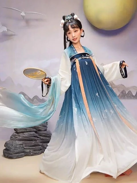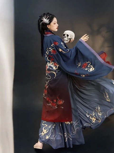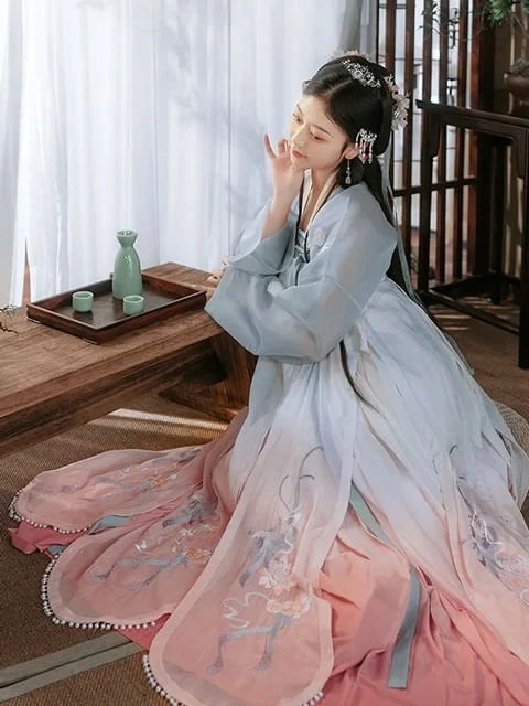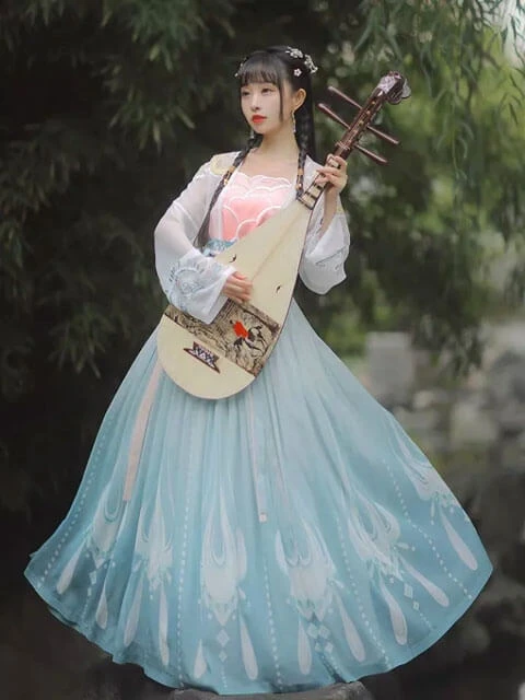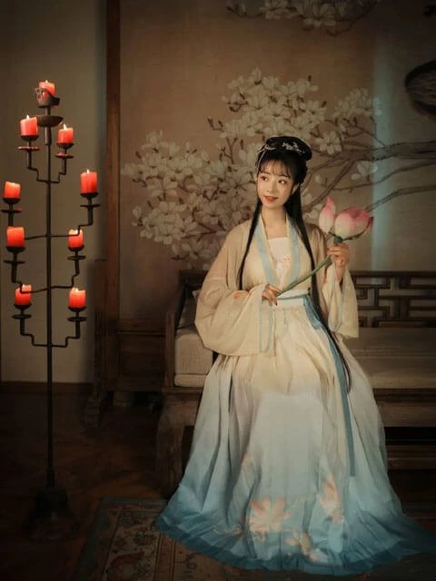 The style of this pair of Qiyao Shanqun is different from the previous collaborations. Beige short shirt, the color is gentle and easy to match, the placket has pearls as decoration, exquisite and beautiful, with its own elegance. The gradient colored skirt is very chic, with a lotus print at the hem, echoing the theme. Wear these Chinese elements Hanfu, you'll look like a young lady from a scholarly family.