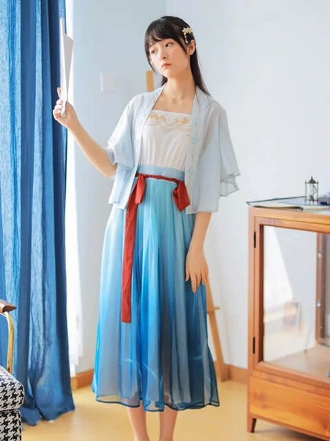 The light blue short-shirt is a fresh color, like a clear sky. The sleeves have peach flowers embroidered on it, beautifully and lovingly, echoing the hem of the skirt. If you like pink and blue in color, don't miss it.