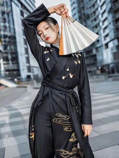 The Magic Blade a collaboration with Chinese elements "Sanxitang" and "Qinian", both of which are designed with ink and wash elements. The black "prayer for the new year" is a black Jiaoling Qiyao, which is full of grace. The black one-piece Qiyao skirt, with white cranes and flowers at the golden curry waistband and a thin chiffon fan pattern gradient print on the outer body. The grey gradient sleeved shirt adds a touch of sophistication to the look.