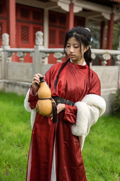 The skirt is a poqun, or broken skirt, with eight pieces alternating patterns. A gold and red woven trim decorates the skirt head, matching the outer ru’s collar and cuffs. It also has pockets! All together this makes an ethereal four-piece set perfect for those who want the dreamy immortal look inspired by xianxia dramas. It’s also quite warm given the extensive layering. an_gel.a_q did an amazing job modeling this set, as she’s a former dancer.
