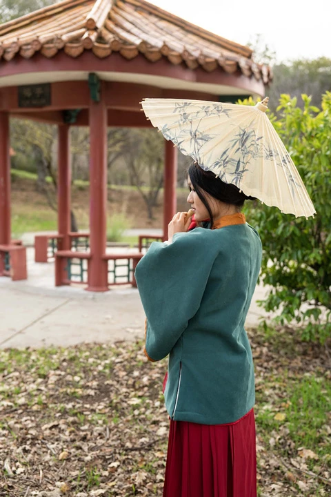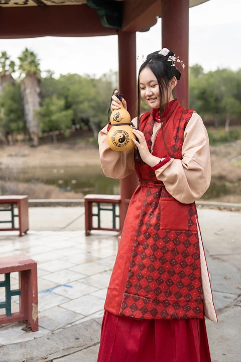 First up is Jizhu! This is a late Ming Dynasty four-piece set consisting of a 百迭裙/百迭裙/bai3 die2 qun2/hundred-layered skirt, a 立領衫/立领衫/li4 ling3 shan1/standing collar top, a waist tie, and a 比甲/比甲/bi3 jia3/bijia vest with a pocket, the star of the show. The name 機杼/ji1 zhu4/Jizhu essentially translates to loom. Textile fabrication was a huge part of Chinese history. In the Ming Dynasty, methods like jacquard satin, brocade, and other iconic textiles were developed, and since it’s a bit more contemporary compared to the other dynasties, the Ming Dynasty has the most complete fabric artifacts that we can really see the details of.