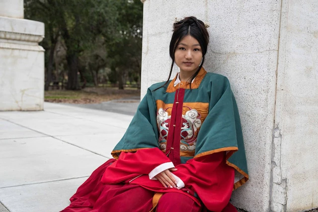 Hey look it’s me! This is probably the simplest set out of all of them, a Tang Dynasty unisex quekuapao, a type of round-collar robe that was originally only masculine but became popular with women in the middle of the Tang Dynasty. This one features an asymmetrical design pieced together with two different fabrics, one with a very subtle original medallion print and one solid burnt red-orange satin. If you look very carefully, you’ll see tiny rabbit designs in the medallions!
