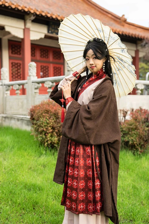 The bottom piece for this is the iconic 馬面裙/马面裙/ma3 mian4 qun2/horse-faced skirt, made of a very heavy 200D polyester sure to keep you warm. It also has two hidden pockets, because what is the point of life if you don’t have pockets? The inner top is a cross-collar Ming Dynasty top that peeks out from under the outer layer a little bit—it’s a slightly brighter solid red chiffon for contrast against the muted skirt.