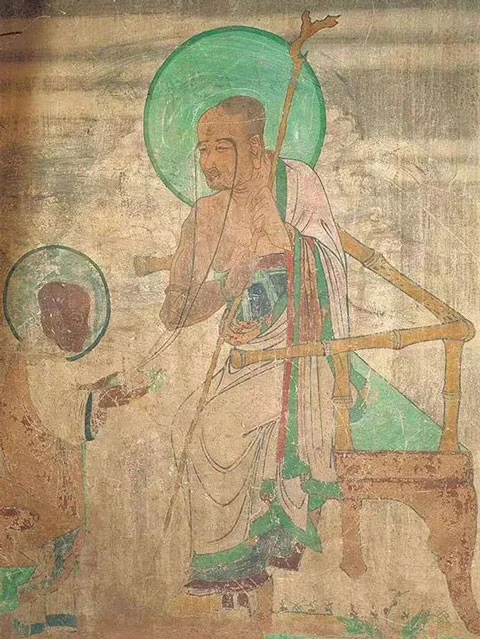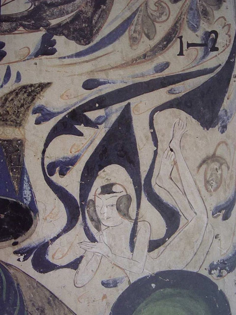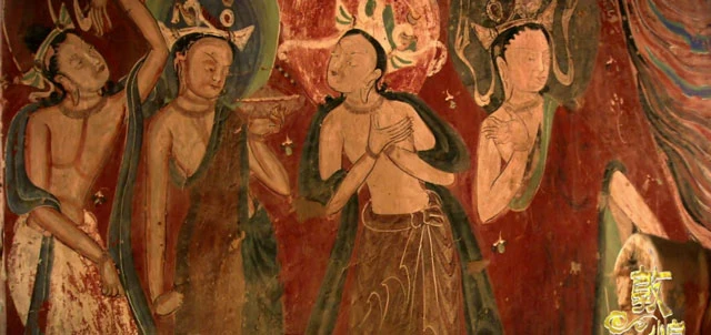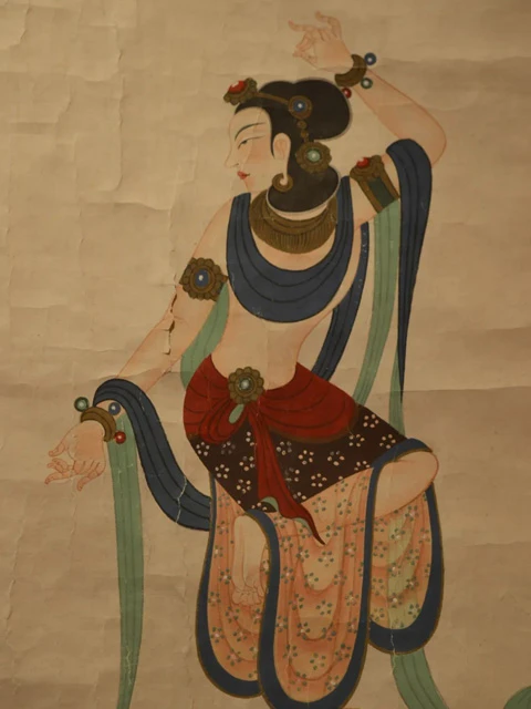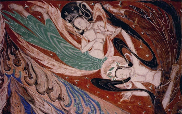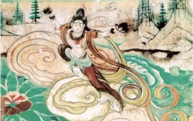 The Dunhuang flying apsaras image that first appeared in the Northern Liang period (a dynastic state of the Sixteen Kingdoms) still retains the original western style. The bald head, thick looks, nakedness, and posture with a wide range are quite rough and simple, only the flying scarf shows a trace of softness.