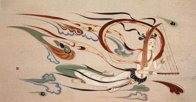 The well-known Dunhuang flying apsaras image is one of the images in Dunhuang murals. It is all over major grottoes and mostly appears in the form of group portraits. Every apsaras is graceful, hovering and dancing, wrapped around light gauze skirts, holding musical instruments in their hands, and being full of momentum.