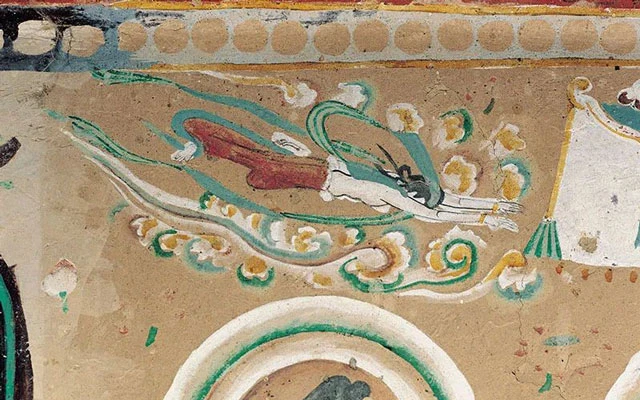 From the beginning of the Sui and Tang Dynasties, the flying apsaras image changed from an individual to a group portrait, reaching the peak of aesthetics. The posture is soft and graceful, and the clothing is complex and diverse. It fully draws on daily clothes and has great humanistic expression.