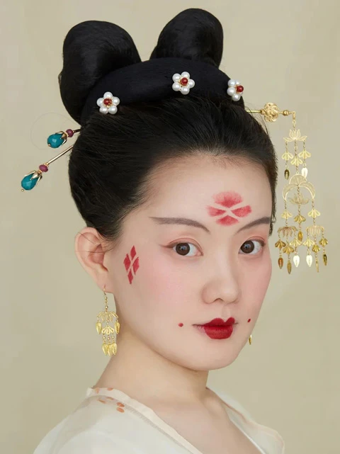 Therefore, various forms of facial makeup patterns have been fully developed at this time. Different eyebrow styles and lip styles, with variable and exaggerated hairstyles, rich facial embellishment style, have created colorful and varied makeup styles for women in the Tang Dynasty.