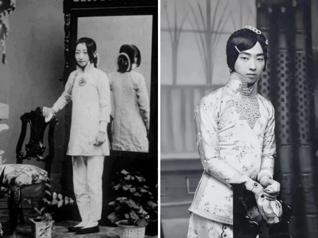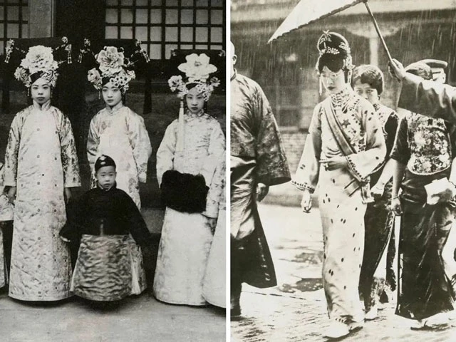 Left: Qing Dynasty aristocrats in Qi style dress; Right: Wanrong, the last empress of the Qing Dynasty, wearing glasses and cheongsam