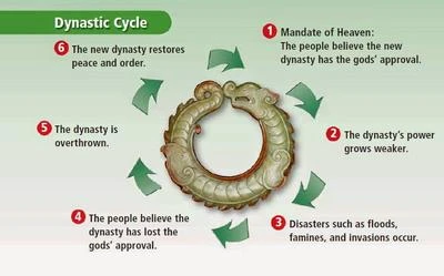 There’s a phenomenon in Chinese history that we call the Dynastic Cycle. Ancient China was ruled over by many different time periods called Dynasties, each with a family of rulers, and most of these follow the same general scheme: the central ruling power is established, the population goes up and the country flourishes, corruption starts affecting the political scheme, people revolt, and the country either dissolves into several warring states or gets conquered by another group of people. Then one state emerges victorious over the other ones or the invaders, the next dynasty is established, and the cycle repeats.