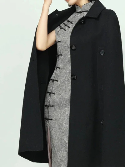 A winter coat can be a warm and stylish outer layer to wear with a cheongsam during the colder months. Characteristics of a winter coat that can complement a cheongsam include a longer length, thick insulation, and a structured silhouette.