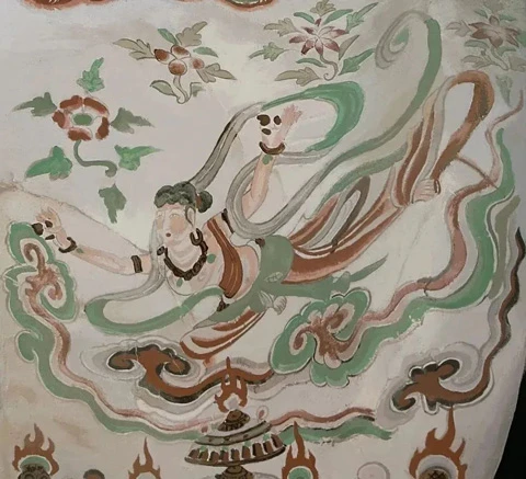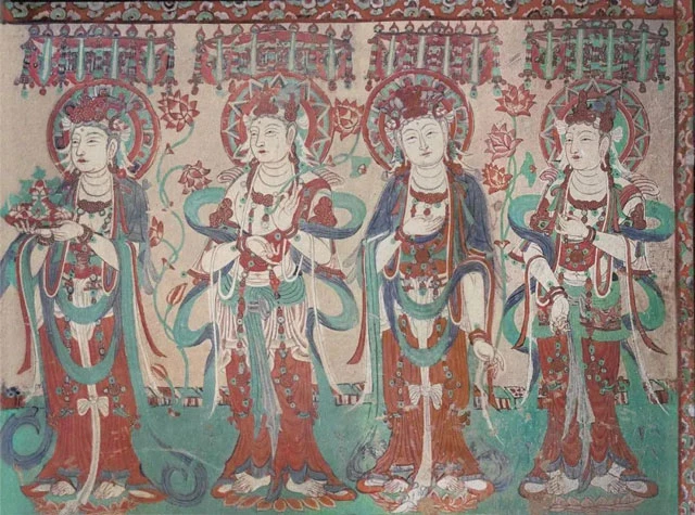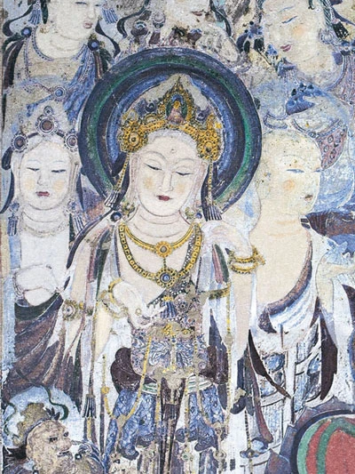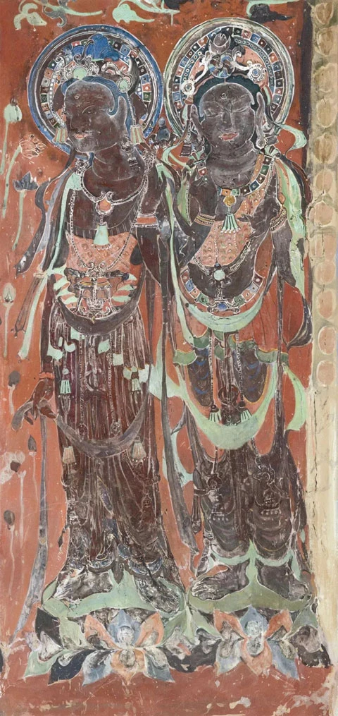 The two bodhisattvas in Cave 57 at Dunhuang are the best interpretation of the colors of the Tang Dynasty. The colors of the crown and the necklaces are divine and dazzling.
