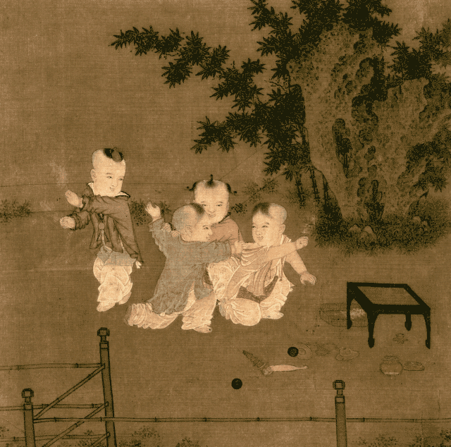 This painting depicts children playing in the courtyard of a Southern Song nobleman. The young woman and the woman beside her watch intently as the two children play. One child with a wooden racket was about to hit the ball, while another shouted sharply at him, The four people in the picture have their eyes focused on the tiny sphere at the same time.