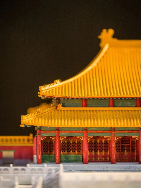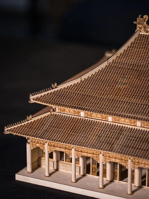 The Hall of Supreme Harmony is the highest-ranking royal building in Chinese history. It has a total of 72 columns, 32 on the outer eaves and 40 on the inner perimeter. The roof components alone number up to 80,319 pieces. It took Mr. Shi two years to create this model from the research and development stage to the finished product. It has the highest-level palace roof and is the only building with ten ridge beasts.