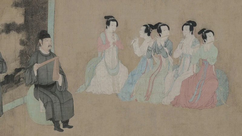 In the painting, most of the performers are wearing Ruqun (a narrow-sleeved jacket with a long skirt and a Pibo), with straight or crossed collars and a tight chest wrap. The overall look is slender and delicate, with the long and narrow Pibo adding a touch of elegance to the dress.