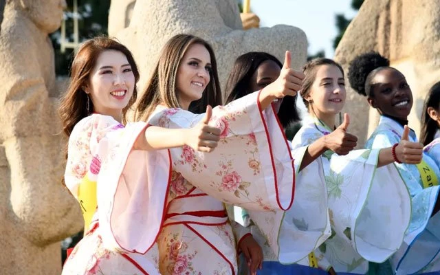 Miss Tourism World 2019 global finalists, wearing Hanfu, walk into the Langyatai Scenic Area in Qingdao on Oct. 3, 2019.
