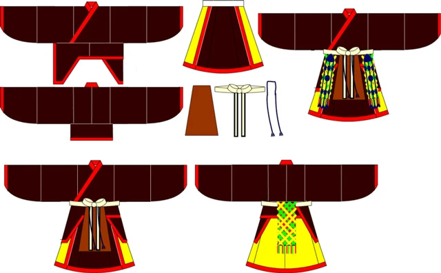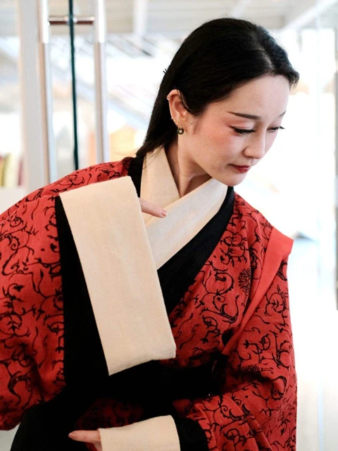 The upper garment of Xuan Duan is the cross collar, the lower garment uses seven pieces of cloth: three in the front and four in the back, with the upper part being "Xuan" (dark blue-black) and the lower part being "Xun" (light-vermilion). The color of the lower garment varies depending on the wearer's status and the occasion, yellow or yellow-red colors are mostly used, representing the colors of the earth and fire, appearing warm and mild.