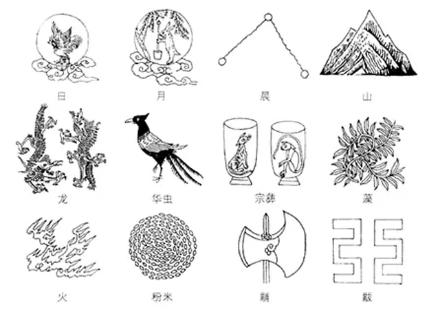 In addition to clothing, decorations and patterns were also essential. During the reign of Emperor Shun, the twelve patterns were already established, which included the sun, moon, stars, mountains, dragons, Hua Chong, Zongyi, algae, fire, rice, Fu, and Fú. According to the "Rites of Zhou", only the sun, moon, and stars patterns were allowed on flags, while clothing could only have nine different patterns. Only the Zhou emperor was permitted to enjoy the full set of patterns, while nobles could only use up to the patterns without the dragon.