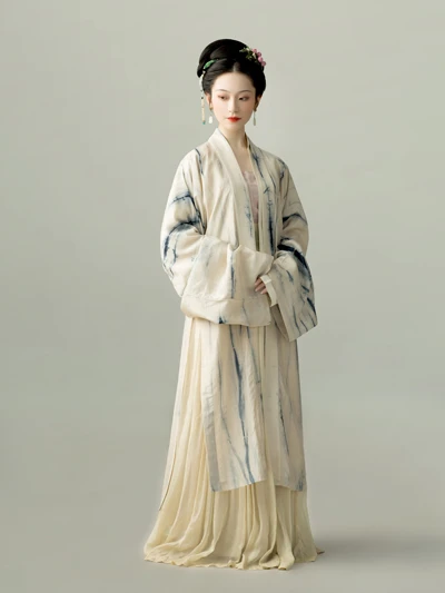If you think that this minimalist style of Song-style Hanfu is too plain, you can also make a big impact on the clothing's pattern. For example, in this set of Song Dynasty Hanfu, the long jacket on the outside has a design similar to tie-dyeing. This casual style makes the design more pronounced and highlights the Chinese characteristics.