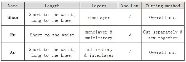 Ru is available in single and multi-layered layers. Single-layer approach Shan, multiple layers approach Ao. Because the length of the Ru is usually only up to the waist, it is also called the "waist Ru". However, there are some exceptions, such as the "long Ru" which is a kind of Ru that is up to the crotch and can be considered an early form of Ao.
