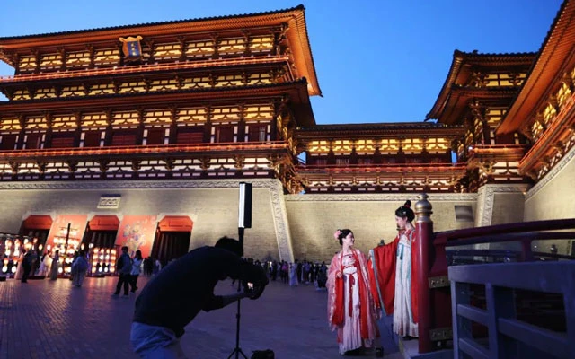 As night falls, this antique street seems to switch to Tang Dynasty night market mode with young people in various dress styles competing for their favorite ancient scenery. Photographers holding cameras and fill lights, directing guests to pose, have become the busiest people in the entire ancient city.