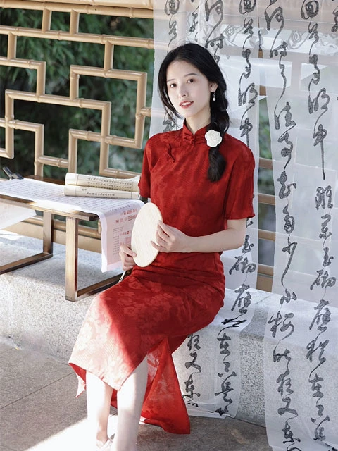 Generally speaking, cheongsam has features such as right lapel large front opening or semi-front opening form, stand-up collar buttoned with loop fastening, side-slit, flat cutting with single-piece fabric and connected sleeves, it can be called a cheongsam.