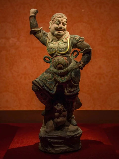 This pair of warrior Tianwang figurines unearthed from Hansenzhai in Xi'an are dressed like warriors, muscular build, wearing helmets and armor. The craftsmen used exaggeration techniques to highlight the deterrent power that these Heavenly Kings had over evil spirits.