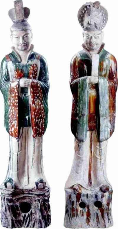The civil/military official figurines unearthed from Anpu Tomb in Luoyang represent the peak development of this type of figure. The 112 cm tall civil official wears a black Jin Xian crown on his head and a green high-collared wide-sleeved coat over a long Liangdang with white sashes hanging between his legs. He also has cloud-shaped shoes with upturned tips.