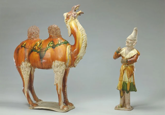 Camel figures are another common type found among Tang Sancai ceramics creations since camels played an essential role along the Silk Road carrying goods between China to Central Asia then westward towards Arabia.
