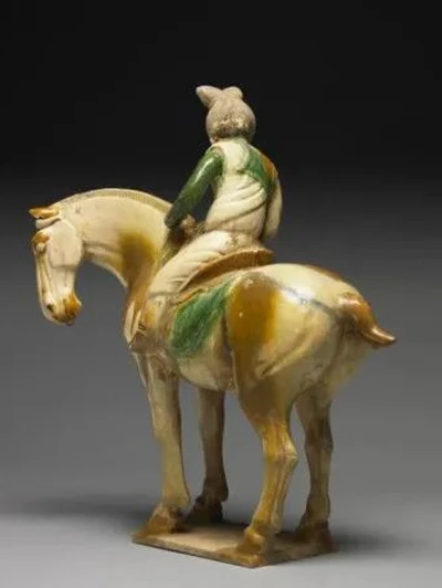 Another type of horse figurine is that which depicts a person riding a horse like this 35.5 cm high Tang Sancai lady figurine held at Taipei’s Palace Museum collection. The woman sits astride her yellow horse, while she turns sideways slightly leaning forward holding reins with left hand while using right hand to strike ball on stick.