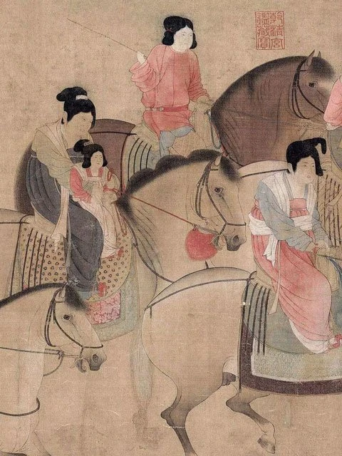 If a dynasty has a color, the Tang Dynasty must be the color of the delicate red and green flowers. The dresses of the ladies in the picture below are red and green, the most common color combination in the Tang dynasty and the dresses were often in different colors. The contrasts are great. Orange on top and blue on the bottom, or green on top and egg yolk on the bottom, red, orange, yellow, green, blue, and white each with their own variations, the women of this era seek individuality.