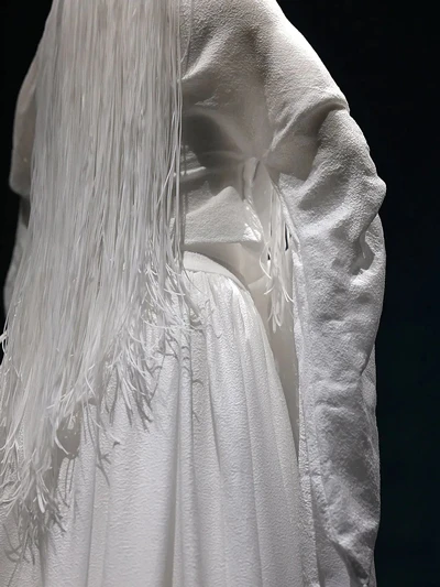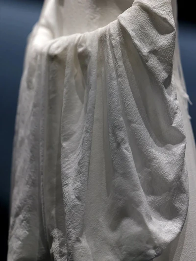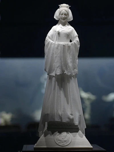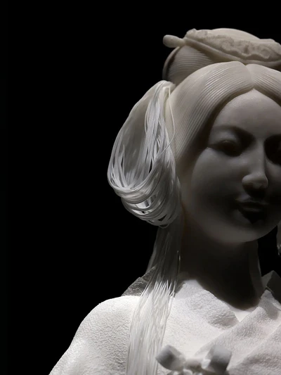 This artwork, created by a contemporary artist, breaks through our usual imagination of materials. It uses porcelain to simulate thin and translucent clothing, portraying the texture and folds of the garments flawlessly. The depiction of individual strands of hair is exquisitely detailed, leaving viewers in awe.