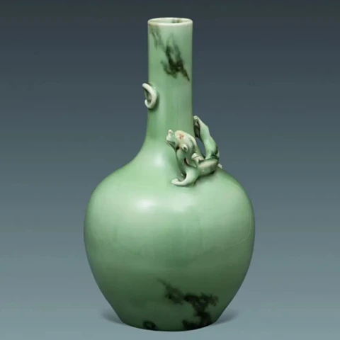 This vase is entirely covered with imitation stone glaze, with a chilong dragon relief on the neck and shoulder. The dragon is portrayed using realistic techniques, capturing its essence and presenting a natural and lifelike appearance.