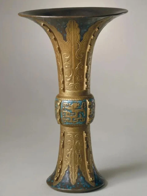 This vase has an outward flared mouth, a bulging belly, and an outward flared foot. There are spear patterns on all four sides of the body. The inside and outside are both based on a bronze color, supplemented with turquoise glaze and gold and silver enamels, with additional decorations of bronze rust spots.