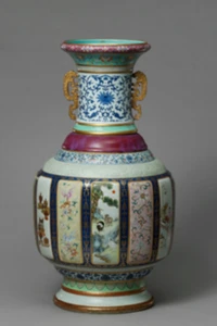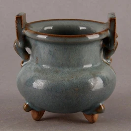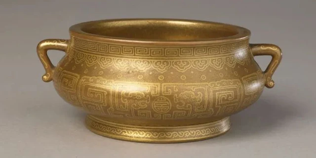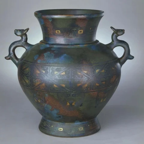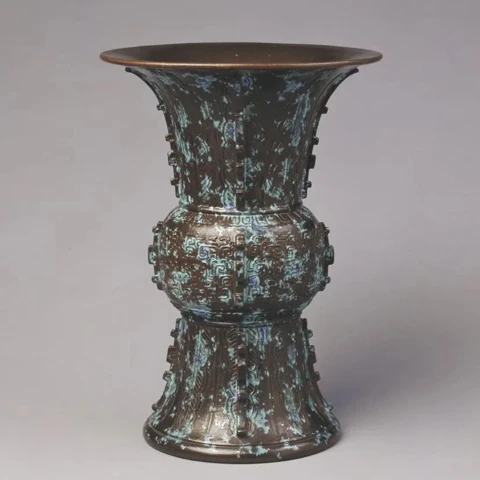 Ancient copper red is an innovation during the Qianlong period, which imitated ancient bronze in terms of shape, color, and decoration. Some of them, embossed copper patterns on the tea-leaf glaze with a color similar to ancient bronze. Others added red, blue, and green enamel rust spots to make the effect more realistic.