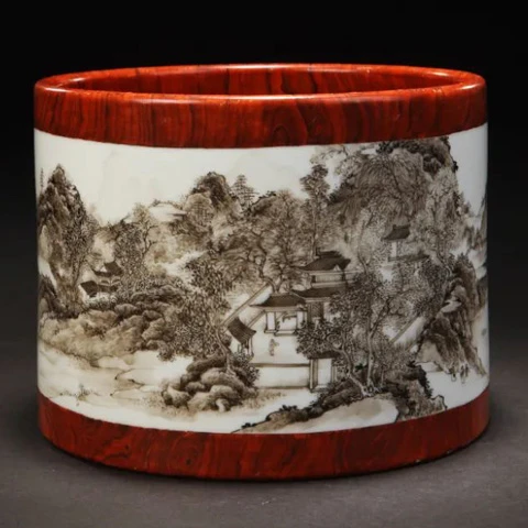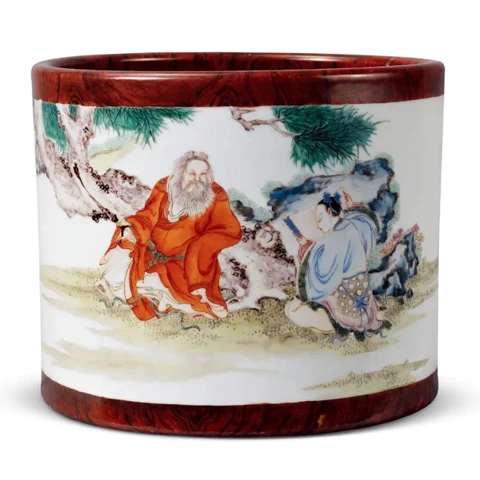 The imitated wood grain glaze famille rose figure ink brush holder, now housed in the National Museum of China, is decorated with imitated wood grain glaze on the outer edge, foot, and inside of the vessel. The middle part of the outer wall is painted with famille rose landscape figures on a white glazed background. A literati in brocade robe is sitting under a tree, accompanied by a book boy.