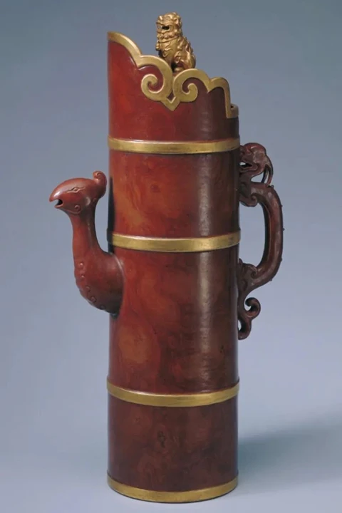 The Duomu pot is a vessel used by ethnic minorities in Manchuria during the Yuan Dynasty to hold milk. This wood grain of this imitated wood porcelain is elusive, resembling the grain of burl wood, giving it a solemn and elegant appearance. The body of the vessel is in the shape of a dragon, with a phoenix head as the spout and a golden lion as the knob. The craftsmanship is exquisite.