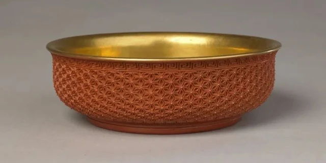 This bowl imitates carved lacquerware, with full gold decoration inside. The outer wall is covered with red glaze, imitating the technique of carved lacquer. There is a carved relief pattern on the mouth rim, and an orderly brocade pattern is engraved on the abdomen. Near the foot, there is a lotus petal pattern. It is almost indistinguishable from real lacquerware, demonstrating Qianlong period superb porcelain-making techniques.