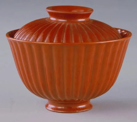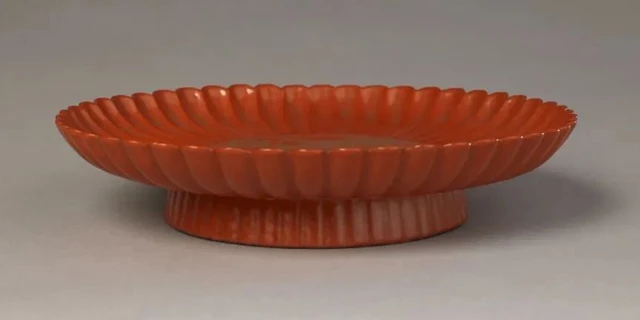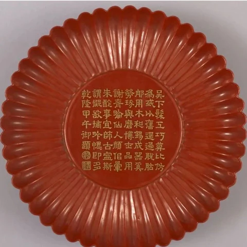 This lidded bowl is similar to the previous plate, also in the shape of a chrysanthemum petal. Both the inside and outside of the bowl are covered with imitation vermilion lacquer glaze, with a realistic color and texture. There is a poem by Emperor Qianlong inside the lid.