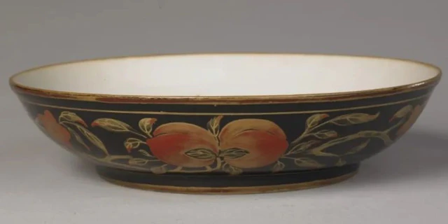 This plate imitates the black lacquerware with gold decoration technique. The inside and bottom of the plate are covered with white glaze. On the glossy black glaze, peach patterns are painted with gold, and red is used to embellish the peach blossoms and fruits, creating a luxurious and dignified color scheme.