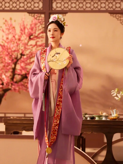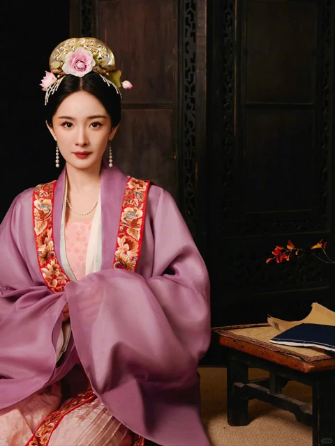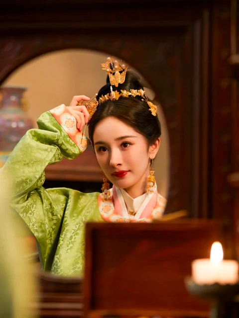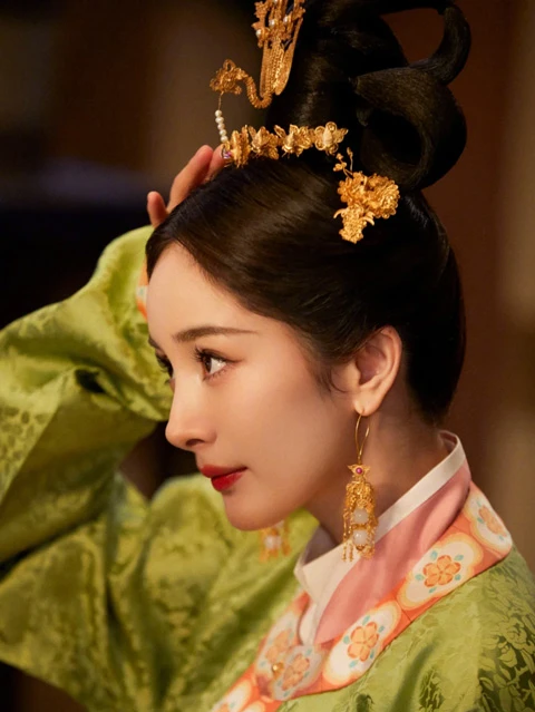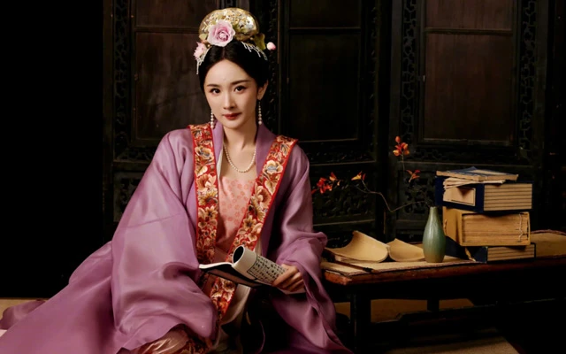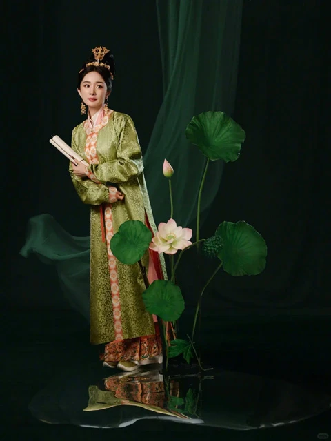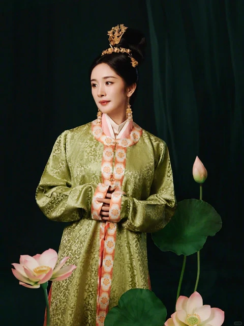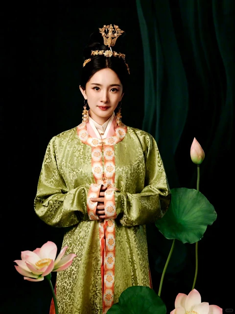 The popular attire for women in the Ming dynasty was the Aoqun, which consists of an upper garment and a skirt, with the "Ao" being a double-layered garment with an inner lining. The collar styles include stand-up collars, round collars, square collars, and crossover collars. Yang Mi's outfit in this style resembles that of a Ming dynasty noblewoman in a painting.