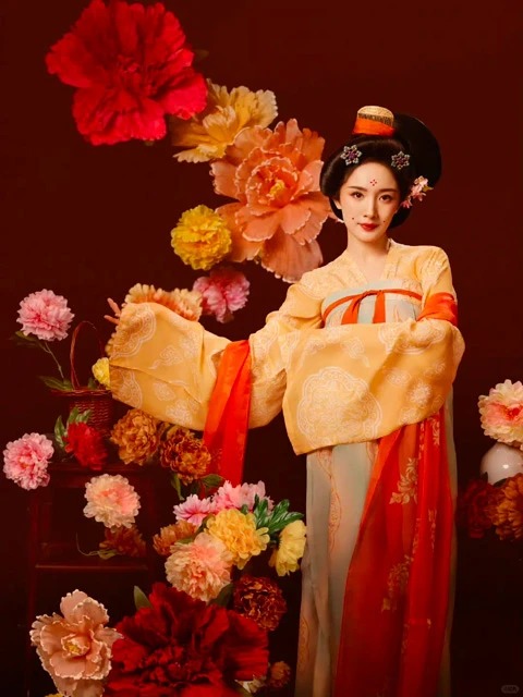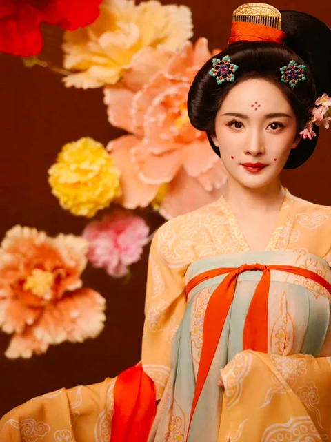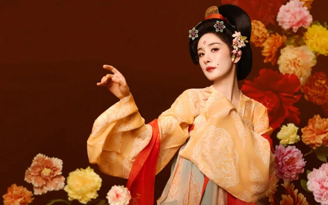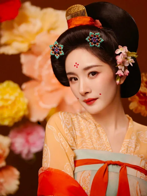 Remember these main elements when it comes to Tang-style attire: Huadian, floral patterns, and high buns. Bold contrasting colors can be used in the color scheme, but this makeup style is not aimed at strict historical accuracy, but rather a softened Chinese-style makeup.