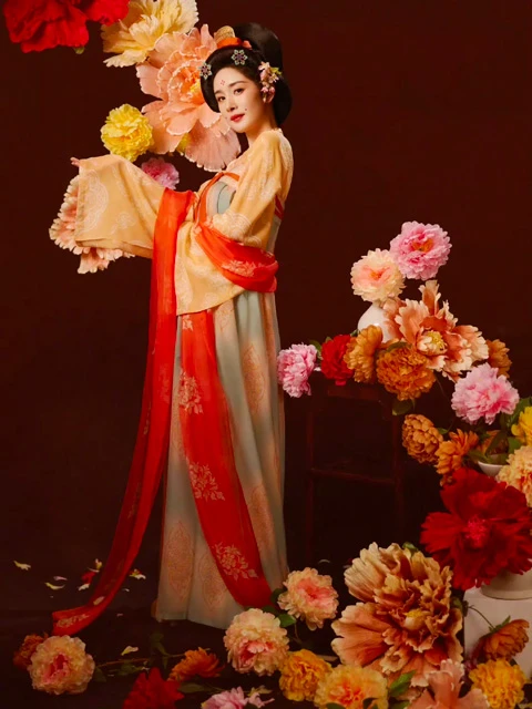 Each dynasty has its own portrayal of noblewomen in paintings, and since the style of these paintings is not limited to the contemporary era, they can be imaginative. The borders of the garments in the paintings are often depicted with meticulous floral patterns, arranged in a regular geometric pattern. The color scheme of this outfit belongs to the contrasting colors of bright red, apricot, and willow green, reflecting the elegance of the Ming dynasty.