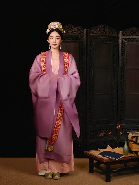 The clothing style of the Song dynasty is slightly more refined and gentle. Yang Mi wore a Tuan crown, flower hairpins, and jade accessories on her head, with an inner layer of a Beizi and an outer layer of a wide-sleeved shirt, complemented by a ceremonial accessory, the Xiapei, representing the attire of noble women in the Song dynasty.