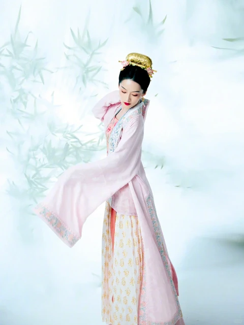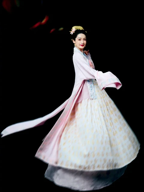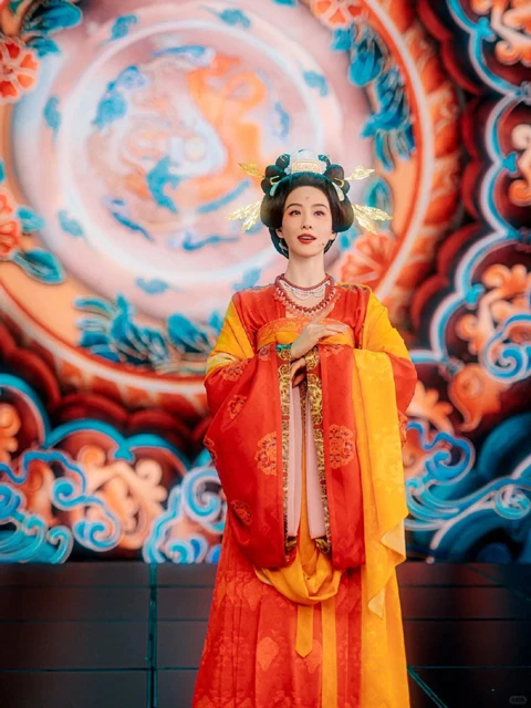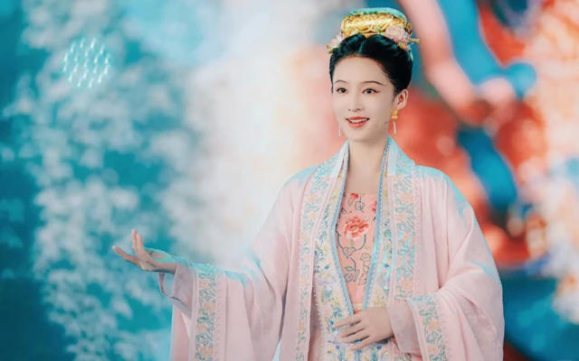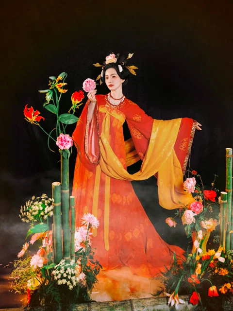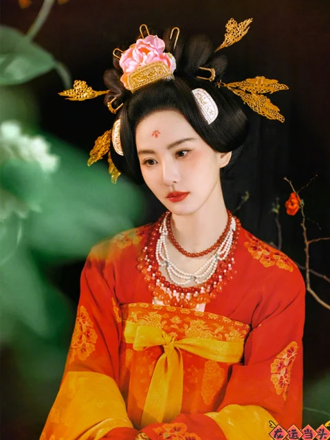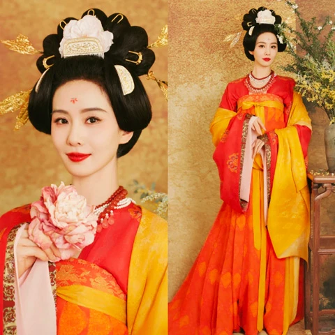 Liu Shishi's attire is a Tang-style Shanqun, with Chinese red as the main color. The border is adorned with the phoenix and bird patterns, while the body of the garment features Dunhuang floral patterns, reflecting the late Tang Dynasty style.