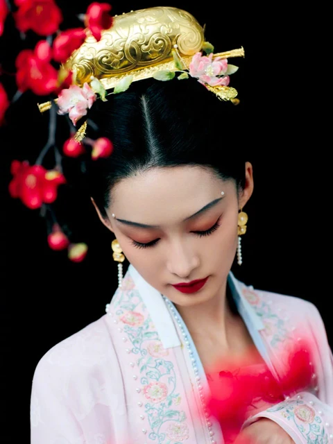 The Huadian falls between the eyebrows, the vermilion lips illuminate the jade face. The elaborate hairpins and hair combs, and the hairstyle of the Tang Dynasty's clustered bun with a flower hairpin on the forehead, constitute a set of festive attire worn by Tang Dynasty women, drawing inspiration from the attire of the donors in Dunhuang grottoes, reflecting great magnificence.