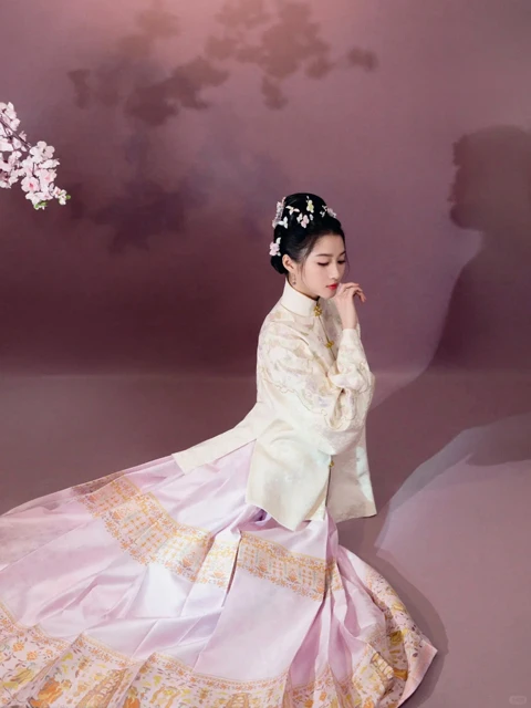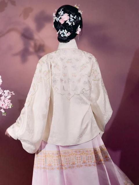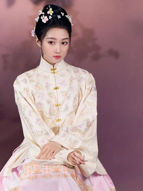 Guan Xiaotong's attire is a mid-Ming Dynasty-style jacket and skirt with a vertical collar. The clothing is adorned with butterfly patterns and "everything goes well" patterns. The shoulder seams are delicately outlined, showcasing the sophistication and elegance of Ming Dynasty attire.