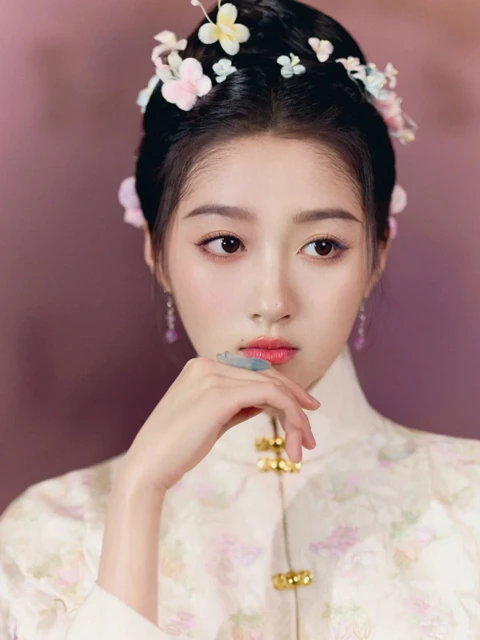 The hairstyle is inspired by the hairstyles in the paintings of landscapes and figures, with a slight hint of the goose tail style. The hair accessory combines butterflies and flowers in a fusion of new Chinese style, highlighting the youthfulness of the outfit. The makeup follows the transparent style of the Ming Dynasty.